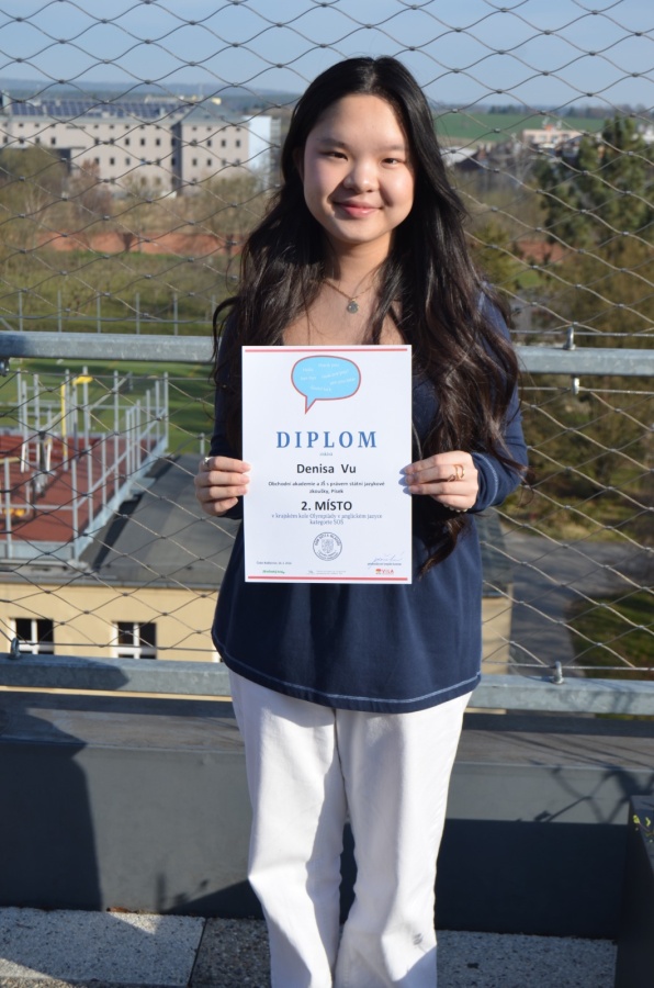 V úterý 24. 3. 2026 se naše studentka Denisa Vu (3.A) zúčastnila krajského kola Olympidády v anglickém jazyce. Reprezentovala naši školu v silné konkurenci vskutku výborně. Získala druhé místo.
