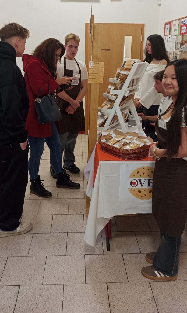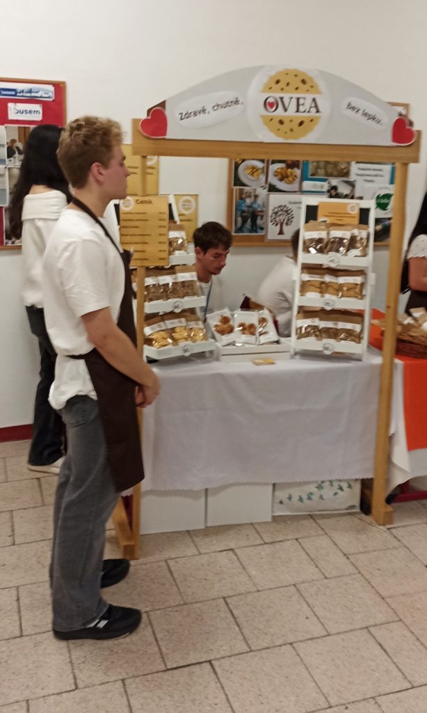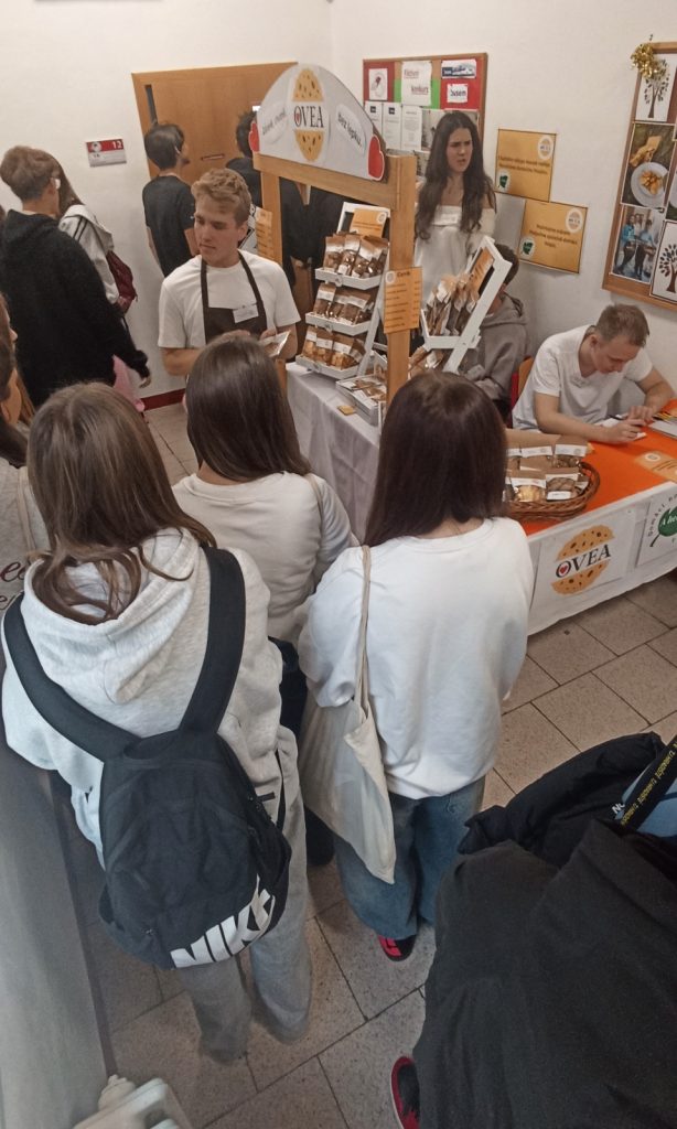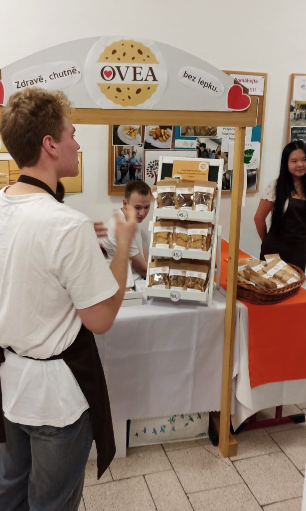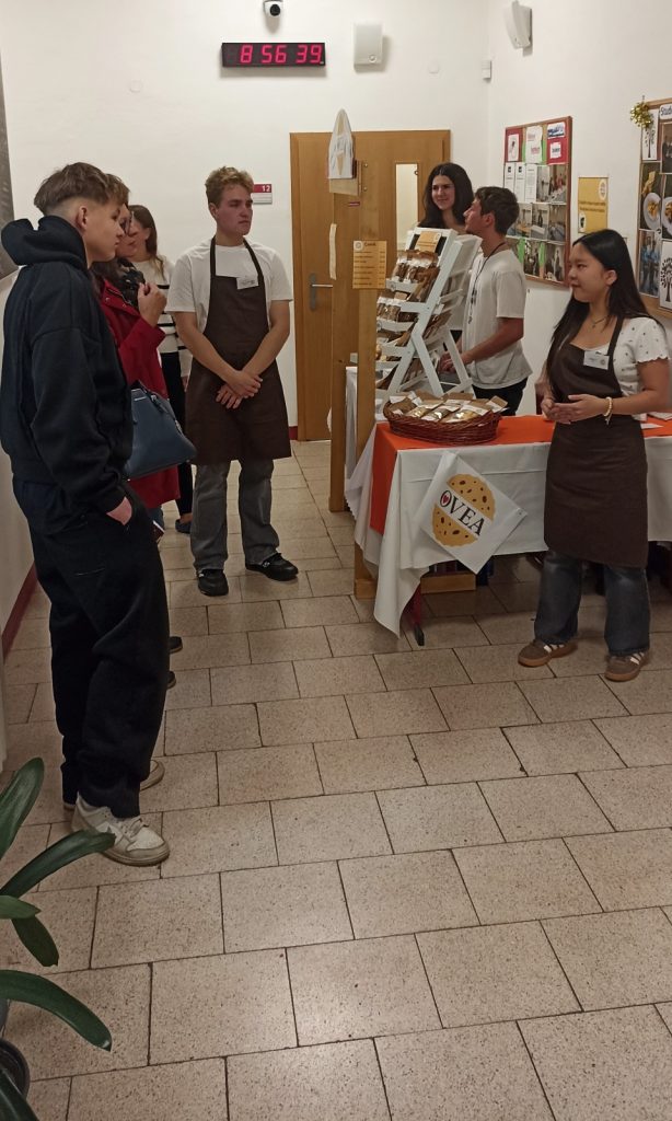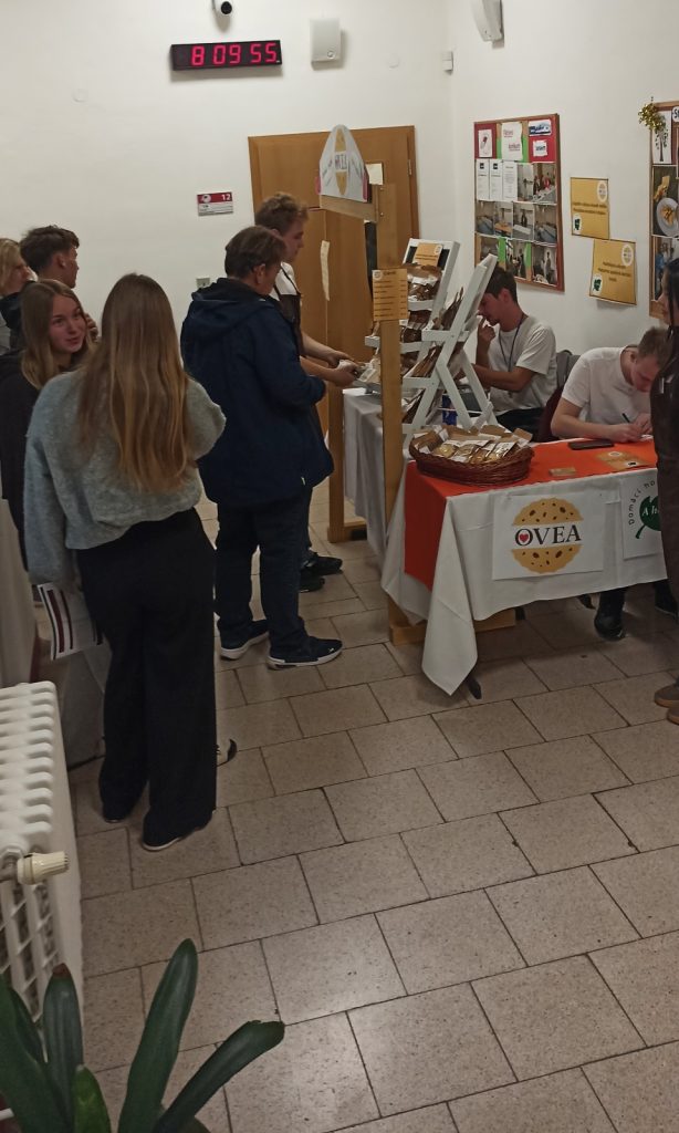 Studentská společnost OVEA dnes představila svou činnost v rámci Dne otevřených dveří zájemcům o studium na Obchodní akademii. Budoucí studenti i jejich rodiče si se zájmem vyslechli příběh vzniku studentské firmy, její první prodeje, úpravy receptur i rozšiřování sortimentu.