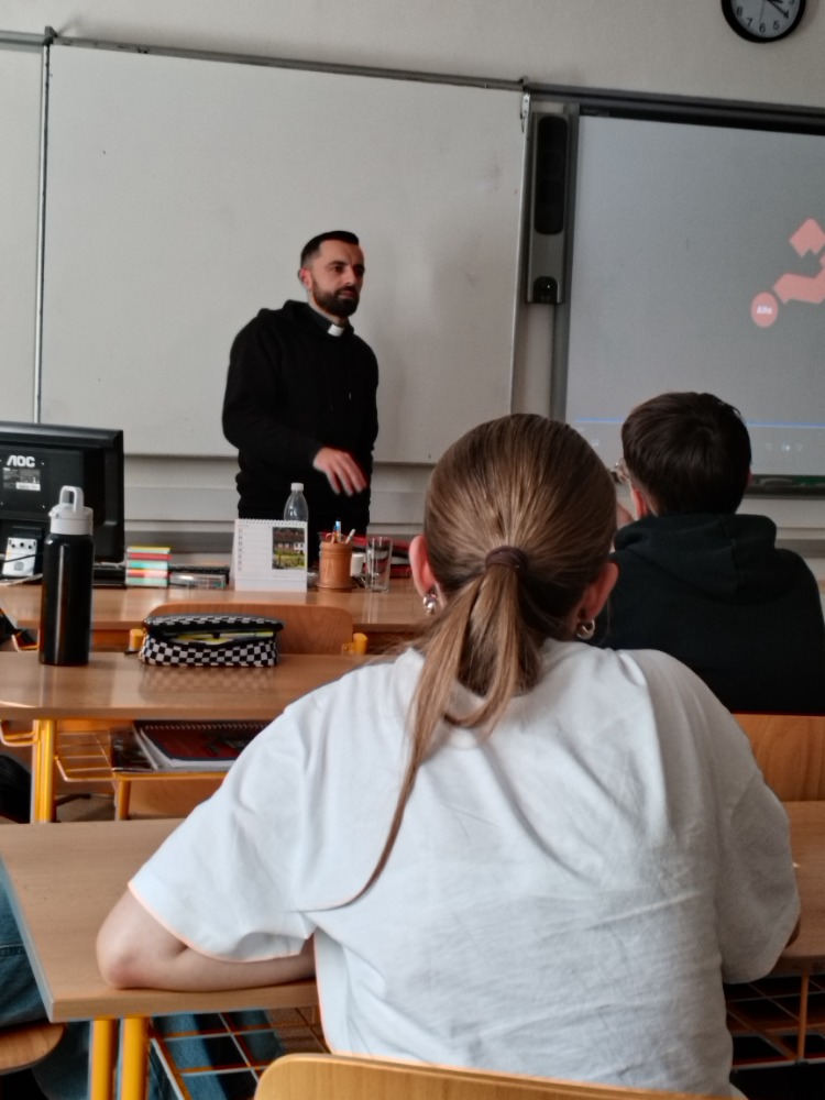 V minulých dnech jsme u nás přivítali R. D. Bc. Viktora Jakoviće, farního vikáře na farnostech Písek a Čížová. Otec Viktor nám není neznámý, většinou se s ním setkáváme o Vánocích v kostele, ale tentokrát jsme nenavštívili my jeho, ale on zavítal mezi nás. Přinesl s sebou nejčtenější knihu světa – BIBLI. Dozvěděli jsme se zase něco nového nejen o této knize, ale i o životě pátera Viktora. Páter Viktor nám vyprávěl o důležitých rozhodnutích svého života a také o své rodině. Měli jsme možnost poznat pátera Viktora zase trochu jinak.